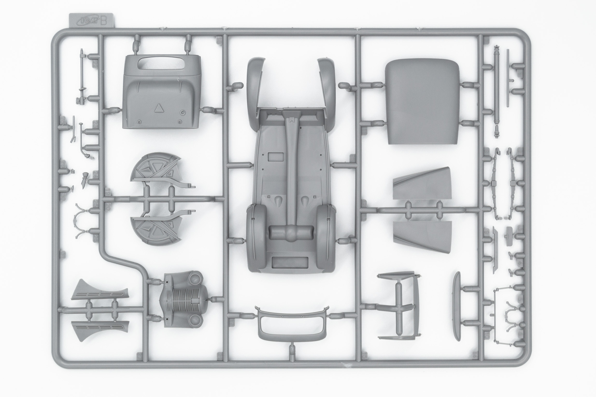 Высокодетализированный сборный двигатель, проработанное подкапотное пространство, капот выполнен отдельными деталями.