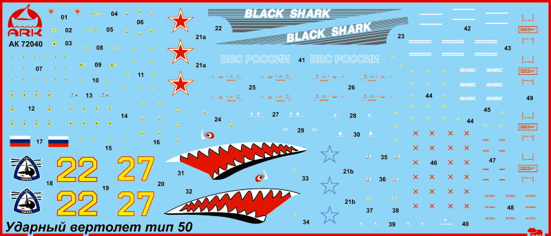 Набор для сборки модели ударного вертолёта Ка-50 «Чёрная Акула» в масштабе 1:72 состоит из пластиковых деталей и деталей из смолы (фигура пилота и два 20-ствольных блока Б-8В20А для стрельбы неуправляемыми авиационными ракетами С-8 калибра 80 мм).