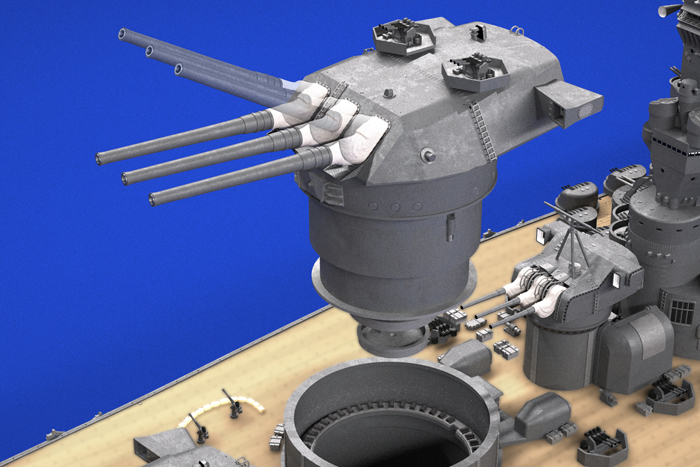 Детализированные палубные надстройки и структуры, спасательный катер, шлюпки, мачты и радары, наблюдательный и разведывательный гидросамолёты с катапультами для запуска, кран и множество других деталей.